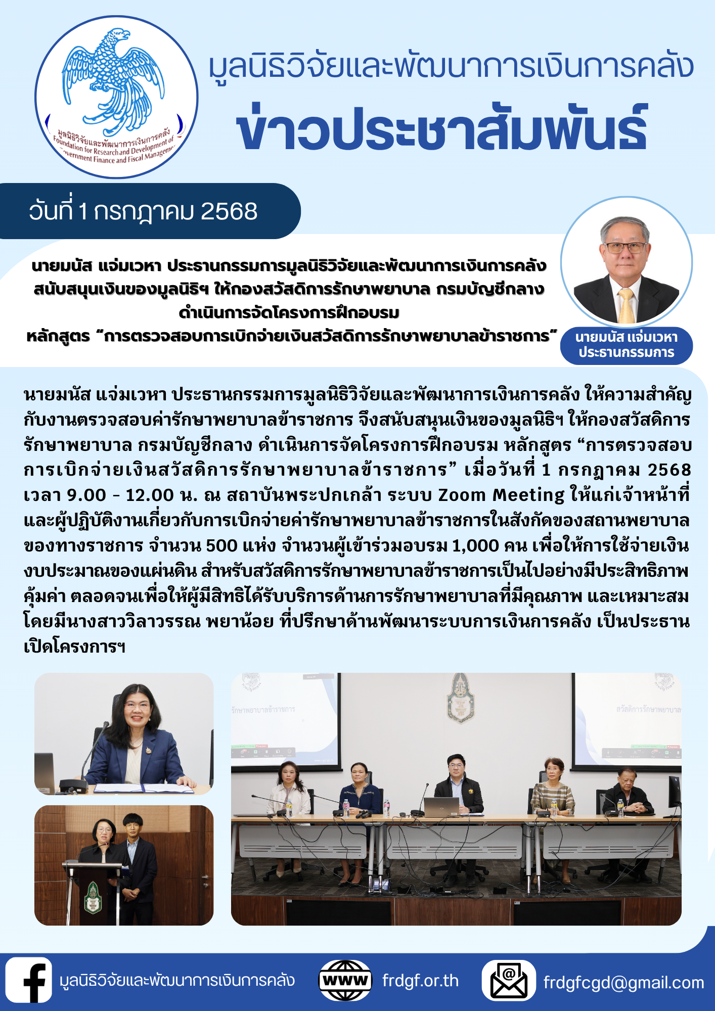 กรมบัญชีกลาง ดำเนินการจัดโครงการฝึกอบรม หลักสูตร “การตรวจสอบการเบิกจ่ายเงินสวัสดิการรักษาพยาบาลข้าราชการ” เมื่อวันที่ 1 กรกฎาคม 2568 เวลา 9.00 - 12.00 น.
