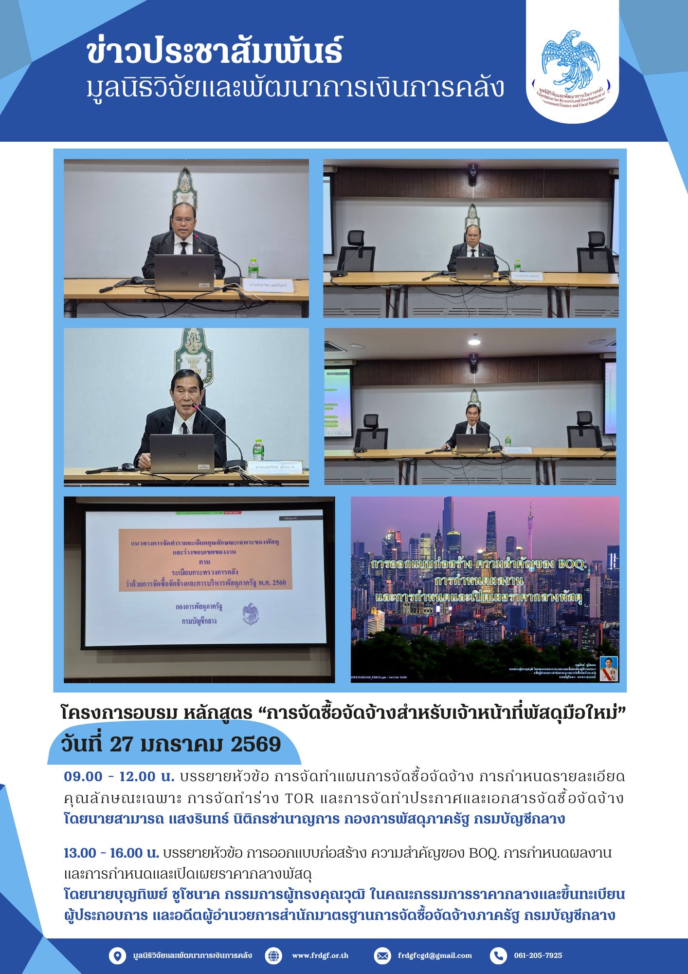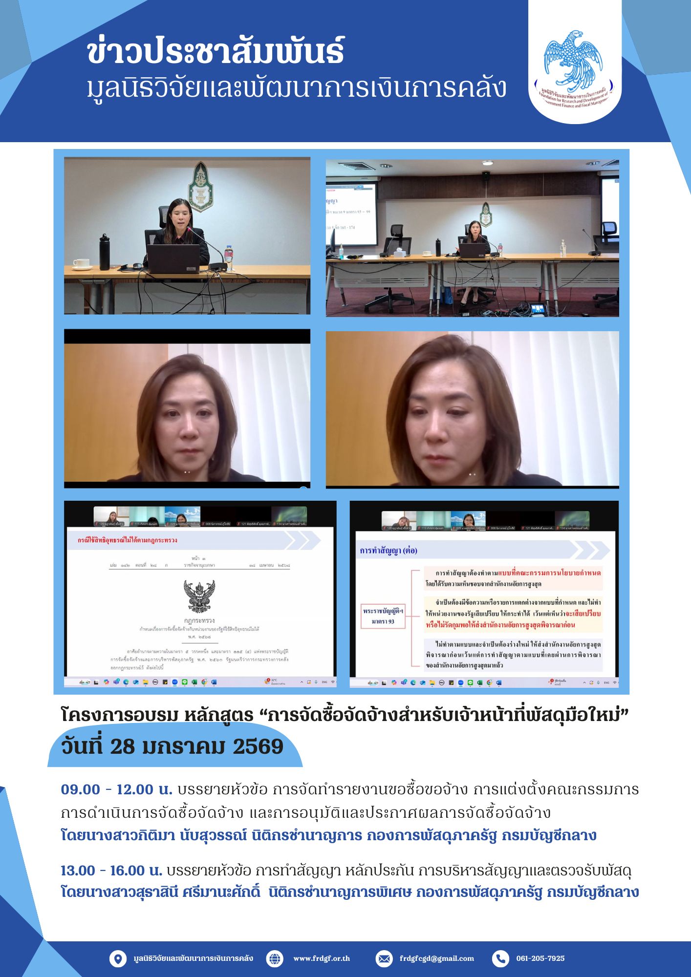 มูลนิธิวิจัยและพัฒนาการเงินการคลังได้ดำเนินการจัดโครงการอบรม หลักสูตร “การจัดซื้อจัดจ้างสำหรับเจ้าหน้าที่พัสดุมือใหม่” ให้กับบุคลากรของหน่วยงานภาครัฐ ระหว่างวันที่ 27 - 29 มกราคม 2569 ในรูปแบบ Online ผ่านทางโปรแกรม Zoom Meeting