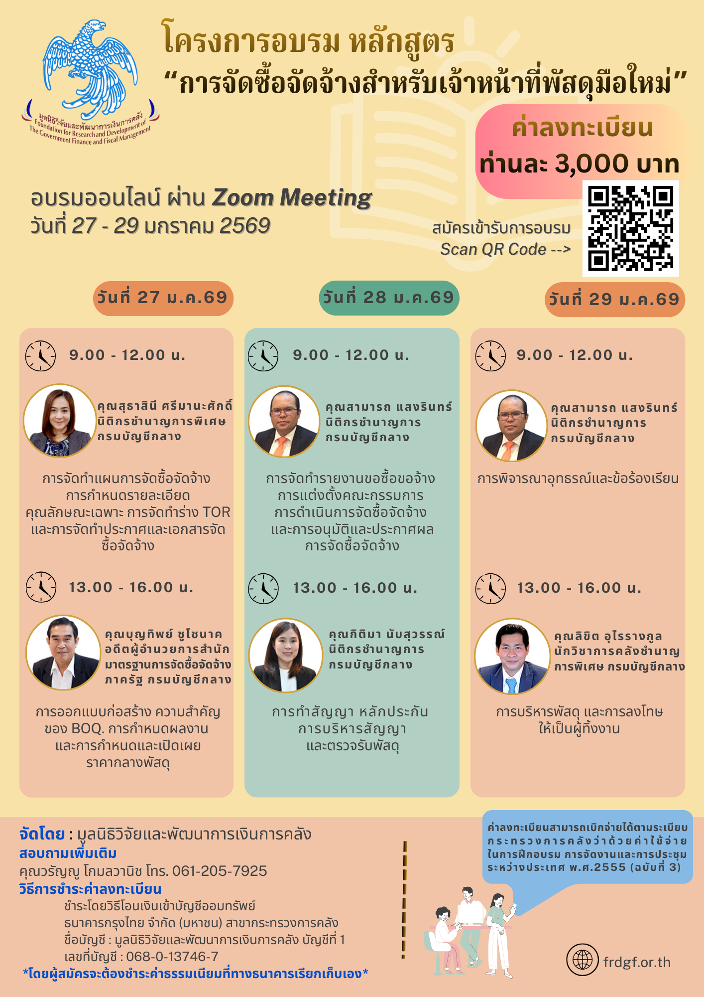 สำหรับเจ้าหน้าที่พัสดุของหน่วยงานภาครัฐ ผู้ที่เกี่ยวข้องในงานด้านการจัดซื้อจัดจ้างและการบริหารพัสดุภาครัฐและผู้ที่สนใจทั่วไป ระหว่างวันที่ 27 - 29 มกราคม 2569 เวลา 09.00 น. ถึง 16.00 น. ผ่านโปรแกรม Zoom Meeting อัตราค่าลงทะเบียนคนละ 3,000 บาท (สามพันบาทถ้วน)
